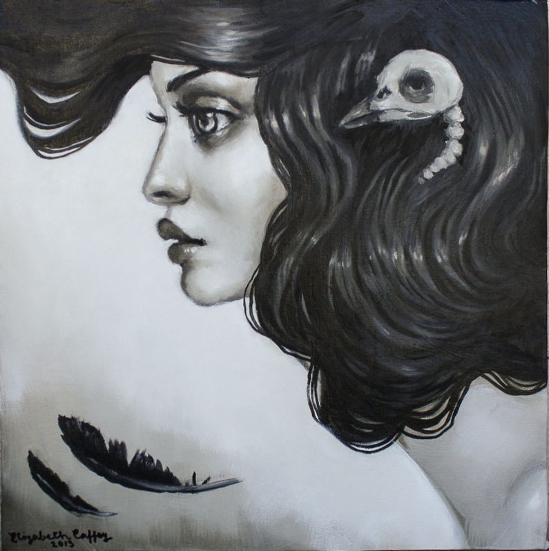"Passerine" 16x16 oil on canvas mounted on wood. I did this one in black and white which is actually made by mixing blue and brown mostly for the darker shades which gives the color a sepia tone feel. This painting is available in my Etsy Shop